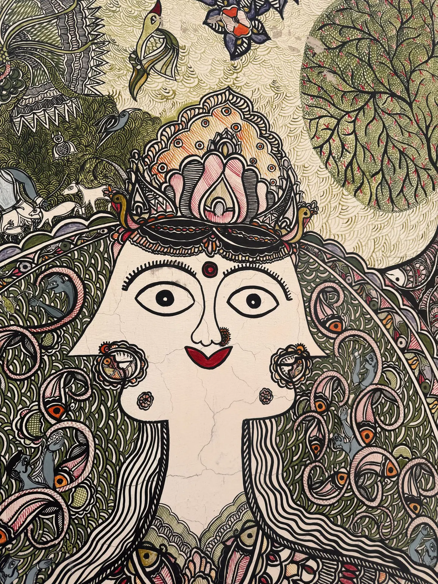 Madhubani blooms through intricate linework, geometric borders, and natural dyes, traditionally painted by women on freshly plastered walls.