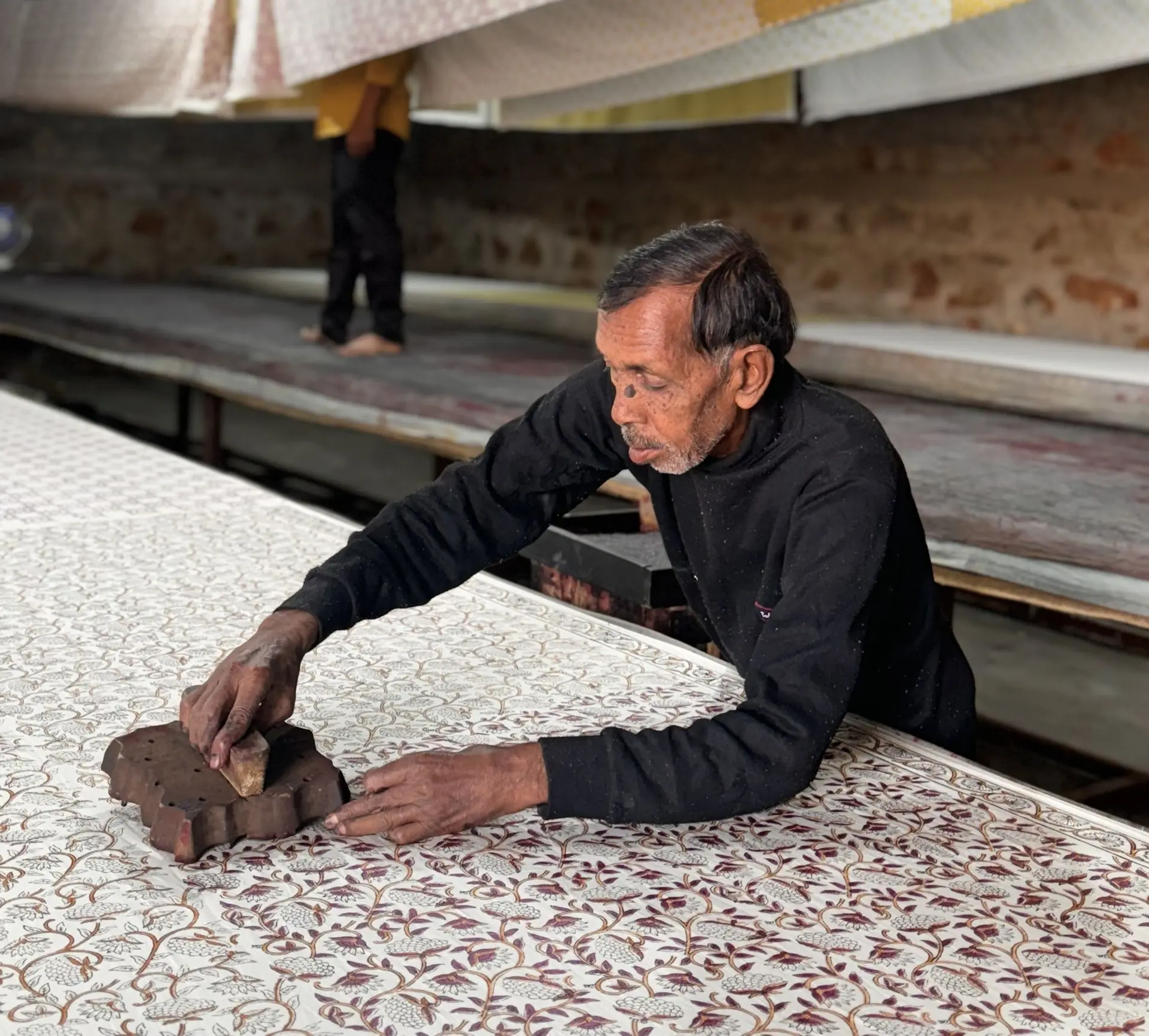 Hand-carved wooden blocks meet dyed cotton to create rhythmic, repeat-pattern textiles.
